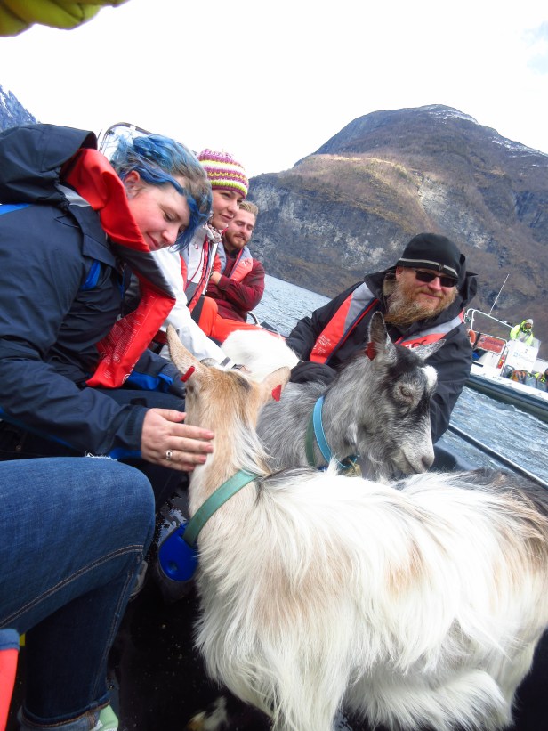 On the boat ride to Undredal, we pick up two goats who we’re in charge of bringing to the festival. Chasing these goats around the slopes of Norwegian fjords and trying to coax them onto our little boat was a blast.