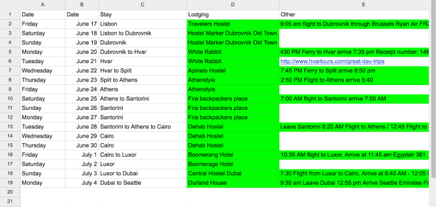 I woke up just in time for the 11 AM breakfast final call and then got to work for the next ~7 hours deciding what I wanted to do and where I wanted to go for the next 18 days, how I’ll get there, and where I’ll stay. I’m so incredibly lucky to get to do this, I pinch myself all the time. After 7 hours here’s how it stands:
